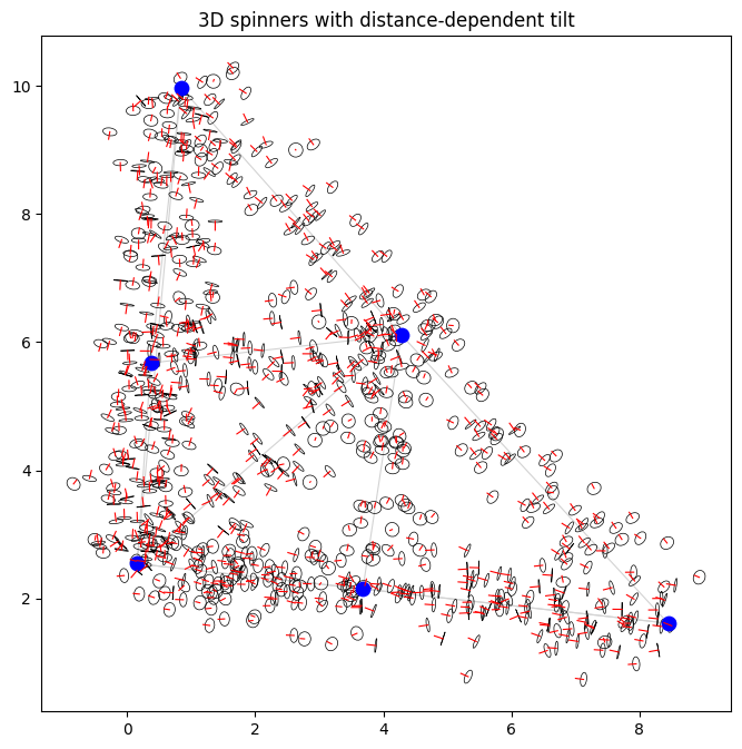 Rotational (attractive) forces act along linear filaments (co-axial alignments) and planar walls (parallel-axial alignments).