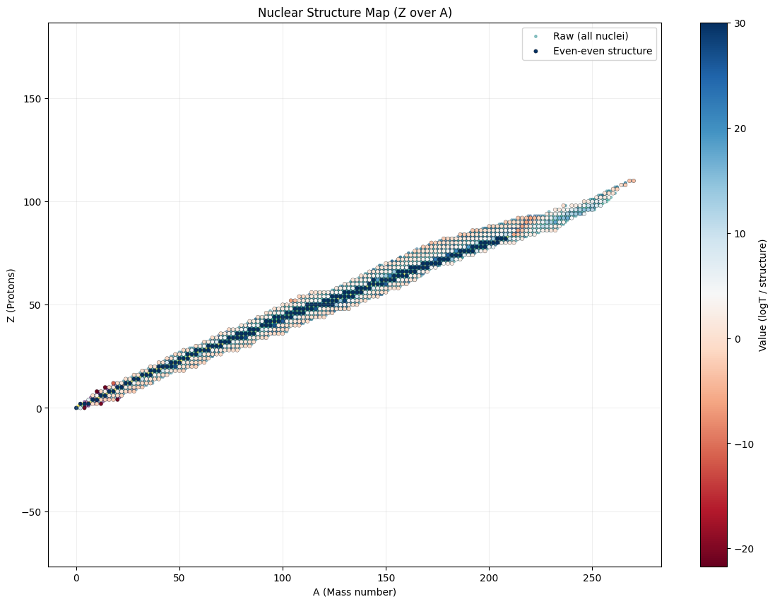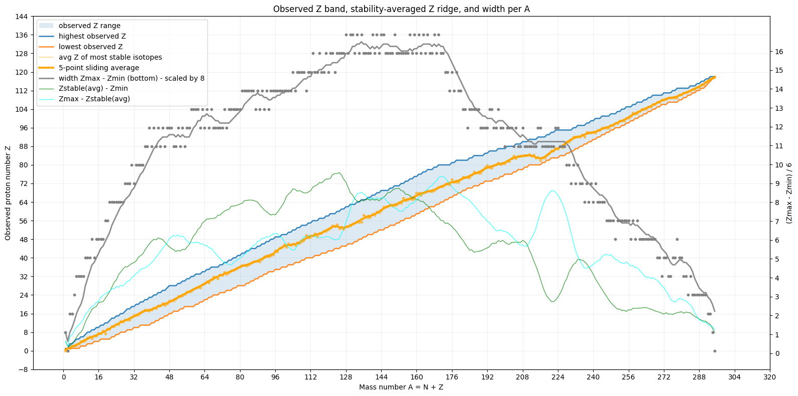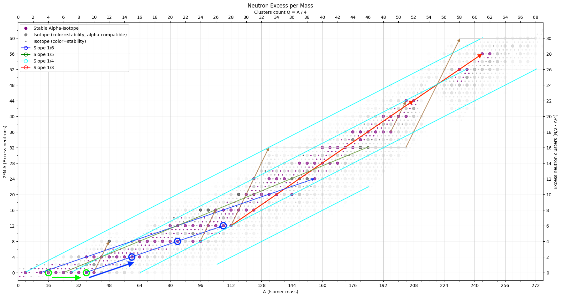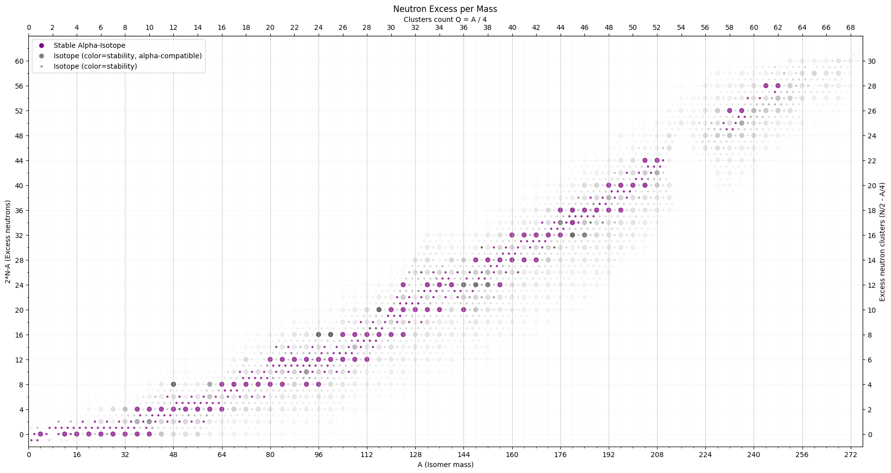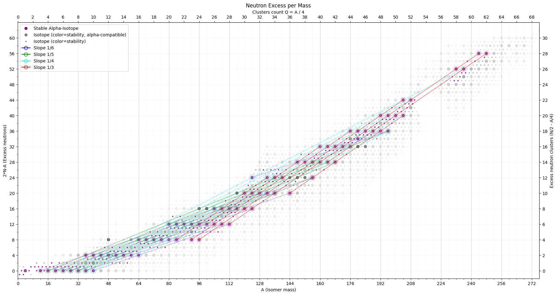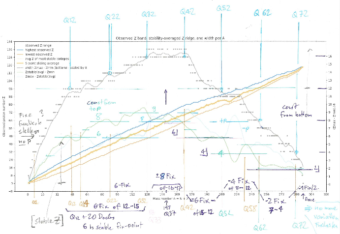 Be invited to investigate the map of atom isotopes in even-even Z (proton) - A (mass) view instead of the typical Z (proton) - N (neutron) view. Mind that only around 1-3 isotopes exist for each mass unit. The main dots show the stable isotopes, where-as the z-axis value indicates decay rate stability. For each core-structure of a given energy (A) one or maybe two of the variations of the number of fixed nodes is the most stable one which will eventually be reached (Beta- and Beta+ decay).